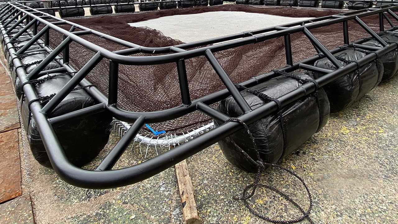 私たち宇和海金網は海面湖面養殖に欠かせないイケス(生簀)や釣り堀用イケス(生簀)、浮き桟橋、各種金属製イカダ(筏)の製造メーカーです。
